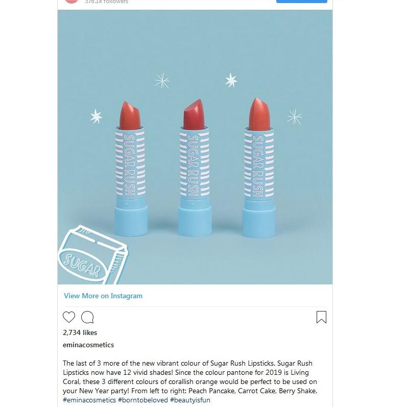 Available in 12 colors. Semua jenis kulit ingredients. Let it be your sweetheart emina sugar rush lipstick adalah lipstick bertekstur super creamy dan warna intens dalam sekali pulas untuk bibir sehat dan berkilau. Yup beberapa bulan lalu brand emina ngeluarin seri makeup terbarunya seri sugar rush yang terdiri dari beberapa produk yaitu face scrub.