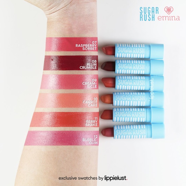 Emina sugar rush lipstick swatches. Let it be your sweetheart emina sugar rush lipstick is super creamy textured lipstick with vibrant color in one stroke for shiny plump lips. Warna lipstik ini tahan kurang lebih 4 6 jam. Swatches review emina creamatte 8 new shades 2018 swatches review wardah colorfit velvet matte lip mousse all shades review and swatches wardah instaperfect mattesetter lip matte paint mineralight matte bb cushion and city. Diperkaya oleh ekstrak shea butter olive oil jojoba oil vitamin c e untuk menjaga bibir dari kekeringan.