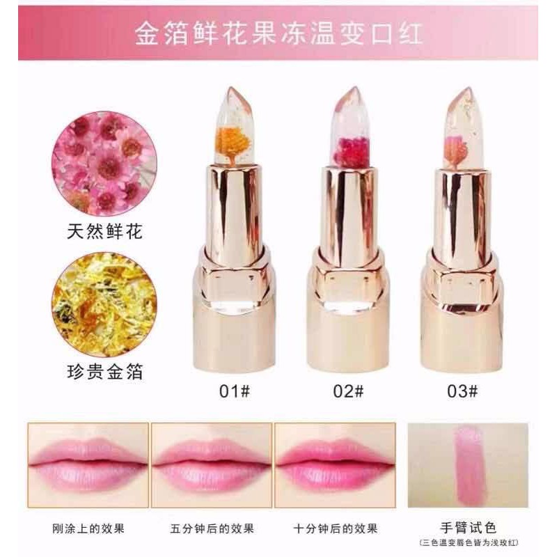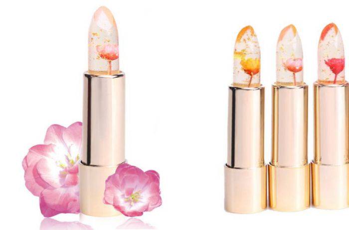 Lipstik bunga keluaran kalijumei bertekstur seperti. Warna yang dihasilkan oleh lipstik ini yaitu pink muda yang menyesuaikan dengan temperatur dan ph yang dimiliki oleh bibirmu ladies. Lipstik ini memiliki tampilan unik yang transparan dengan bunga di dalamnya. Brand kosmetik asal cina yakni kailijumei memulai debut mereka dengan meluncurkan lipstik jelly dengan bunga di dalamnya.