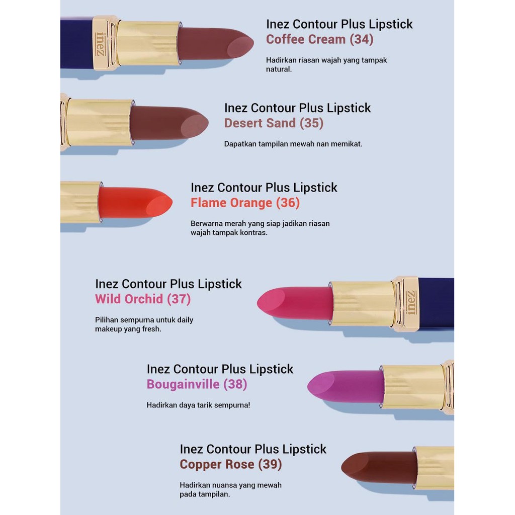 Lipstik inez warna bibir. Video review harga lipstik inez yang bagus warna natural varian color contour plus lip cream suede lip color 900 no 2 orange untuk bibir hitam kering dan pecah pecah. Varian warna dari inez intense color moisturizing lipstick yaitu 01 saprkling carnation 02 sparkling mulbery 03 sparkling cheatnut 04 sparkling champagne 05 sparkling cerry 06 sparkling cirmson 07 sparkling raspberry 08 sparkling. Lipstik inez coral tree no 09 anda adalah penyuka lipstik warna oranye dapat mencoba shade lipstik inez no 09 yaitu coral tree. Harga lipstik inez harga lipstik inez masih dalam batas yang normal dan bisa dijangkau oleh masyarakat indonesia namun jika anda ulik lebih dalam tentang jenis dan tipenya ternyata tidak kalah dengan brand lain yang juga sama seperti itu apalagi memiliki berbagai macam warna yang bisa dipilih untuk mempercantik kulit bibir agar tampak lebih menawan.