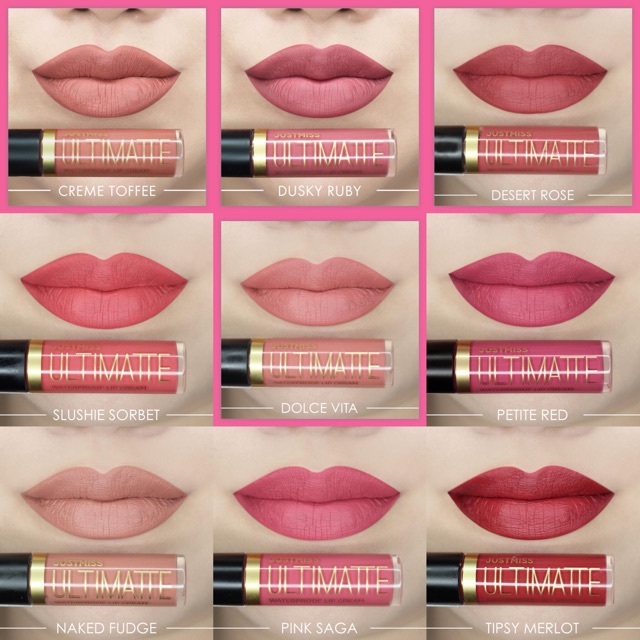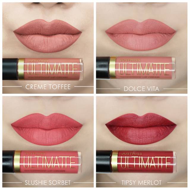 Justmiss ultimatte waterproof lip cream merupakan lipcream dengan pilihan warna warna favorite membuat bibir tampak cantik elegan dengan formulanya yang kaya akan pigmen mengandung vitamin e yang bermanfaat untuk perawatan bibir karena mampu bertindak sebagai antioksidan yang berarti mampu mencegah kerusakan sel kulit yang disebabkan oleh radikal bebas dan juga waterproof.