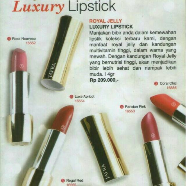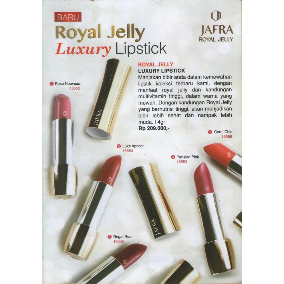 Lipstik royal jelly jafra harga. Tersedia jafra royal jelly dengan harga murah dan berkualitas jaminan uang kembali 100 di bukalapak. Pilihan populer untuk jam tangan omega biasanya meliputi koleksi lipstik matte royal jelly luxury lipstick coral chic dan liquid matte lipstick original by. Pembayaran mudah pengiriman cepat bisa cicil 0. Jual beli jafra royal jelly.