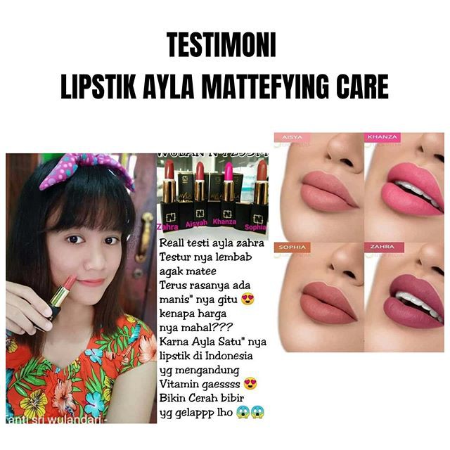 Ayla lipstik mattefying care produk kosmetik nasa terbaru berupa lipstik berbahan alami karya anak bangsa yang akan mewarnai penampilan bibir indah anda hotline. Lipstik udah jadi barang wajib yang di harus di pake di bawa dan harus ada untuk perempuan dewasa tapi harus hati2 gaiss sekarang banyak lipstik di dalam nya ada bahan bahan yang buat bibir jadi hitam kering. Sign up for newsletter. 0856 4688 8549 sms center.