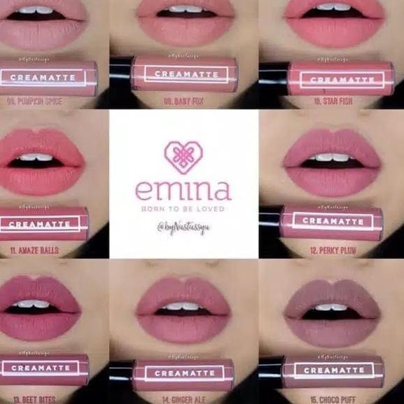 Varian warna lipstik emina matte. Selain hadir dengan shade yang menawan produk ini praktis karena menghadirkan lima varian lipstik dalam satu paket. Warna yang dihasilkan lipstik ini adalah merah keungu unguan dengan nuansa pink yang mirip versi 82 mirah. Emina memiliki varian lipstik yang sangat bagus dan disukai kalangan remaja hingga dewasa. Emina menawarkan beragam produk lipstik yang bisa disesuaikan dengan kebutuhan dan selera remaja mulai dari lipstik matte hingga varian glossy.