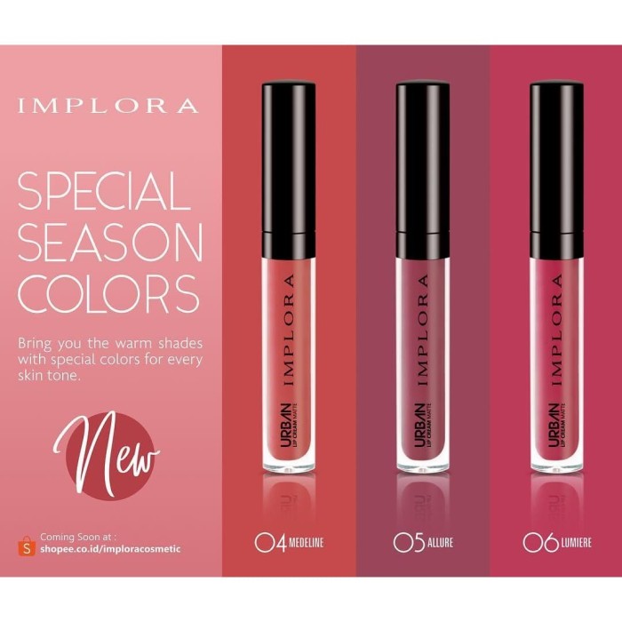 Mengaplikasikan warna merah pada bibir berarti kamu sedang ingin tampil dengan bold look nah kalau bela mempunyai kulit sawo matang dan ingin tampil bold dan elegan popbela sarankan kamu pakai cheek lip tint dari implora shade cherry bomb seperti namanya cherry bomb punya warna semerah buah cherry yang akan memberikan kesan seksi dan berani. Oleh sebab itulah tak mengejutkan jika referensi mengenai warna warna lipstik implora ini bisa menarik perhatian beberapa kalangan. Memilih warna lipstik lebih baik disesuaikan dengan warna kulit agar lebih menarik dan membuat penampilan kulit menjadi lebih cerah dan fresh. Mau matte atau glossy aneka warna lipstik selalu sukses mencuri hati para cewek meski mungkin harganya tergolong mahal untuk ukuran lipstik saja.
